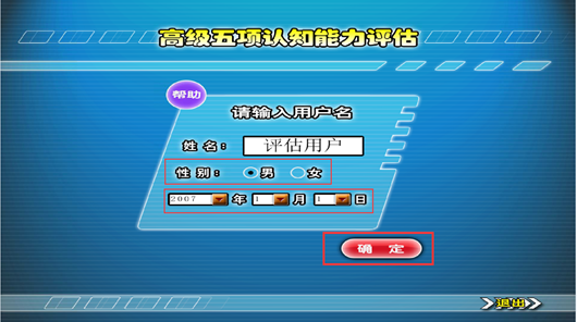 4.进入“高级五项认知能力”评估页面,输入学生基本信息后(性别、出生日期)按实际情况填写,点击“确定”,如下图(4.1)。进入评估程序。