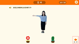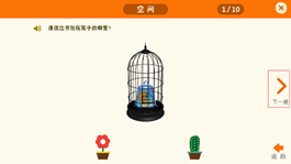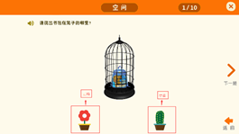 5.每一题都有1张图片,让学生说出图片中物品的位置,如正确点击页面下方的“红花”,如错误点击页面下方的“仙人掌”。如下图(5.1)。完成后点击下一题如下图(5.2)。